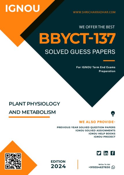 BBYCT 137 ? Bachelor of Science (BSCG) (CBCS) Botany ? IGNOU Solved Guess Papers University: IGNOU Service Type: IGNOU Solved Guess Papers in Hard-Copy Course: BSCG Subject Name: Plant Physiology and Metabolism Language: ENGLISH MEDIUM Delivery type: After successful payment, we will dispatch your selected years of BBYCT 137 Solved Guess Papers in Hard-Copy in your postal address in a same day. In addition, if you have any query or need any support then please contact us on sales@shrichakradhar.com. This is a Printed Hard Copy of IGNOU BBYCT 137 Solved Guess Papers from our IGNOU BBYCT 137 Help Book, which gives an idea about the type of questions asked in examinations. For example, these solved guess papers will help students gain an understanding of the paper pattern and question forms that will be questioned in the exams. In conclusion, here is your chance to get best IGNOU BBYCT 137 Solved Guess Papers from our guidebooks and it will help you to improve your exam preparations.