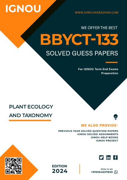 BBYCT 133? (BSCG) (CBCS) Botany ? IGNOU Solved Guess Papers University: IGNOU Service Type: IGNOU Solved Guess Papers in Hard-Copy Course: BSCG Subject Name: Plant Ecology and Taxonomy Language: ENGLISH MEDIUM Delivery type: After successful payment, we will dispatch your selected years of BBYCT 133 Solved Guess Papers in Hard-Copy in your postal address in a same day. In addition, if you have any query or need any support then please contact us on sales@shrichakradhar.com. This is a Printed Hard Copy of IGNOU BBYCT 133 Solved Guess Papers from our IGNOU BBYCT 133 Help Book, which gives an idea about the type of questions asked in examinations. For example, these solved guess papers will help students gain an understanding of the paper pattern and question forms that will be questioned in the exams. In conclusion, here is your chance to get best IGNOU BBYCT 133 Solved Guess Papers from our guidebooks and it will help you to improve your exam preparations.