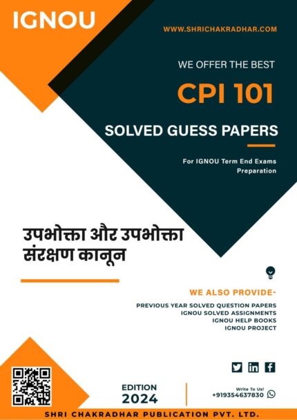 CPI 101? Certificate in Consumer Protection (CCP) ? IGNOU Solved Guess Papers University: IGNOU Service Type: IGNOU Solved Guess Papers in Hard-Copy Course: CCP Subject Name: Consumer and Consumer Protection Legislations Language: ENGLISH MEDIUM Delivery type: After successful payment, we will dispatch your selected years of CPI 101 Solved Guess Papers in Hard-Copy in your postal address in a same day. In addition, if you have any query or need any support then please contact us on sales@shrichakradhar.com. This is a Printed Hard Copy of IGNOU CPI 101 Solved Guess Papers from our IGNOU CPI 101 Help Book, which gives an idea about the type of questions asked in examinations. For example, these solved guess papers will help students gain an understanding of the paper pattern and question forms that will be questioned in the exams. In conclusion, here is your chance to get best IGNOU CPI 101 Solved Guess Papers from our guidebooks and it will help you to improve your exam preparations.