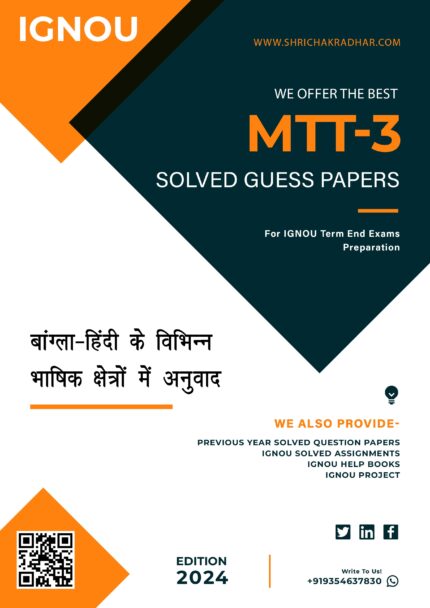 MTT 3 – Post-Graduate Certificate in Bangla-Hindi Translation (PGCBHT) IGNOU Solved Guess Papers University: IGNOU Service Type: IGNOU Solved Guess Papers in Hard-Copy Course: PGCBHT Subject Name: Bangla-Hindi Ke Vibhinn Bhasik Xetro Mein Anuvad Language: HINDI MEDIUM Delivery type: After successful payment, we will dispatch your selected years of MTT 3 Solved Guess Papers in Hard-Copy in your postal address in a same day. In addition, if you have any query or need any support then please contact us on sales@shrichakradhar.com. This is a Printed Hard Copy of IGNOU MTT 3 Solved Guess Papers from our IGNOU MTT 3 Help Book, which gives an idea about the type of questions asked in examinations. For example, these solved guess papers will help students gain an understanding of the paper pattern and question forms that will be questioned in the exams. In conclusion, here is your chance to get best IGNOU MTT 3 Solved Guess Papers from our guidebooks and it will help you to improve your exam preparations.