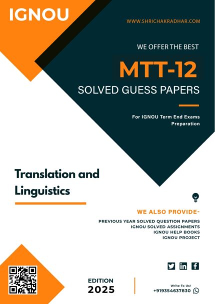 MTT 12 – Translation and Linguistics (MATS) University: IGNOU Service Type: IGNOU Solved Guess Papers in Hard-Copy Course: MATS Subject Name: Translation and Linguistics Language: ENGLISH MEDIUM Delivery type: After successful payment, we will dispatch your selected years of MTT 12 Solved Guess Papers in Hard-Copy in your postal address in a same day. In addition, if you have any query or need any support then please contact us on sales@shrichakradhar.com. This is a Printed Hard Copy of IGNOU MTT 12 Solved Guess Papers from our IGNOU MTT 12 Help Book, which gives an idea about the type of questions asked in examinations. For example, these solved guess papers will help students gain an understanding of the paper pattern and question forms that will be questioned in the exams. In conclusion, here is your chance to get best IGNOU MTT 12 Solved Guess Papers from our guidebooks and it will help you to improve your exam preparations.